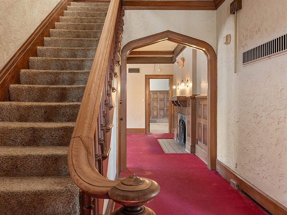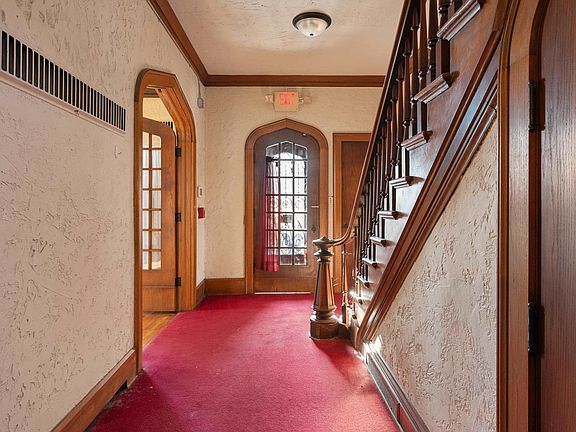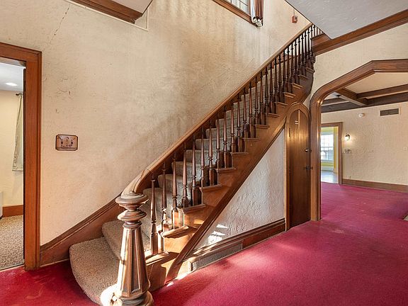 Zoned by the City of Fond du Lac for single-family, duplex, or triplex use, the property presents multiple possibilities for restoration or reimagining. Inside, historic details shine, including a grand oak staircase, rich wood paneling, tall ceilings, and beautiful period millwork throughout.