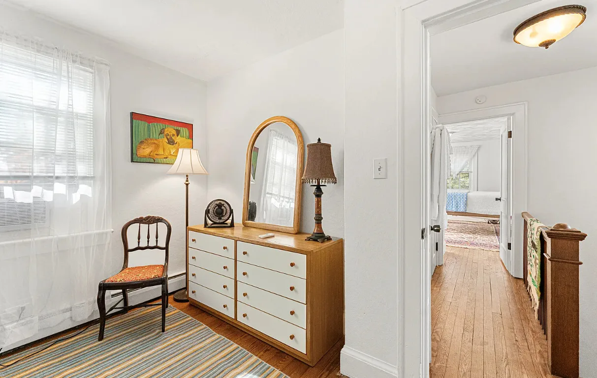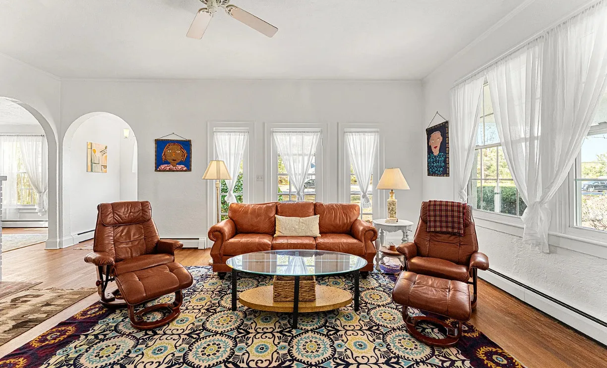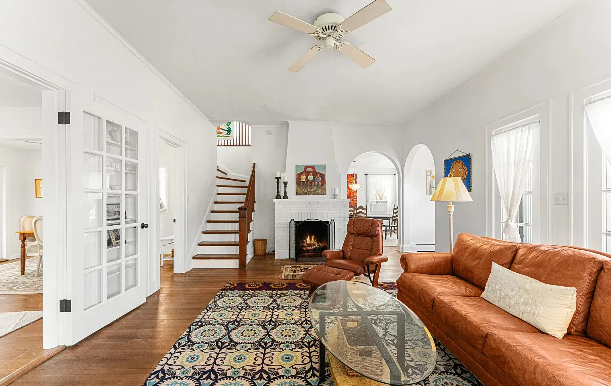 Step inside through the arched entryway into a welcoming foyer that leads to a spacious, sun-drenched living room featuring original hardwood floors, detailed baseboards, and a classic masonry fireplace. The sweeping staircase adds a touch of grandeur, while tall windows allow natural light to pour into every corner.