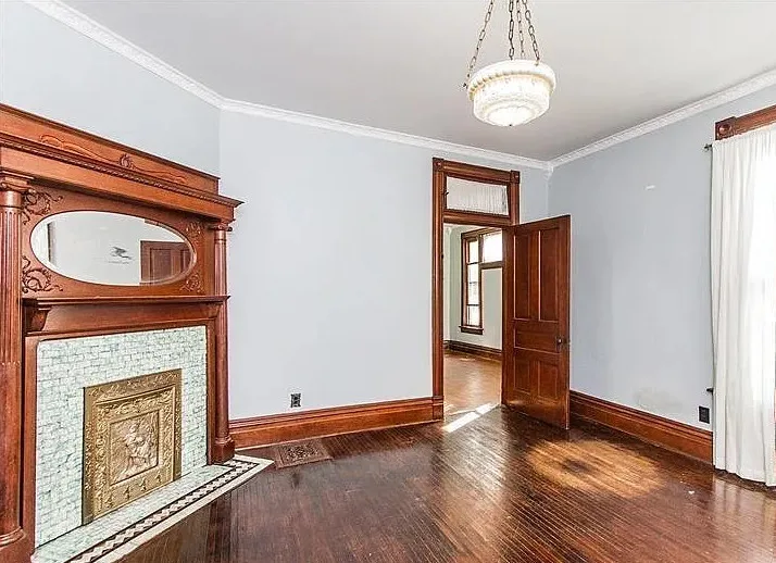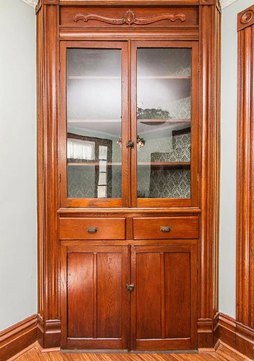 The home spans 2,413 square feet with four spacious bedrooms and two full bathrooms—including one with an original clawfoot tub. The formal dining room still features its built-in china cabinet and perfectly placed windows for a buffet, separated from the living room by large functioning pocket doors. Though the front parlor fireplace is decorative, it remains a beloved centerpiece for conversation.