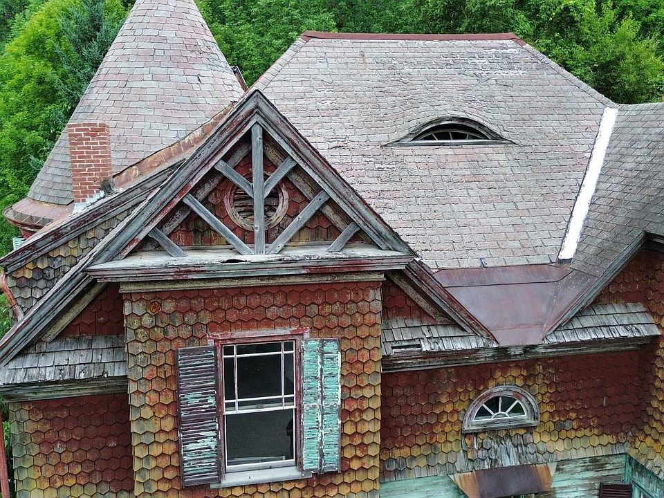 - Architecture: Victorian style featuring a turret, hand-hewn beams, and a cantilevered three-story staircase.