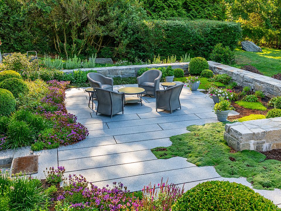 • Outdoor Space: Professionally landscaped rolling level lot, private stone terrace, porch, and lighting.
