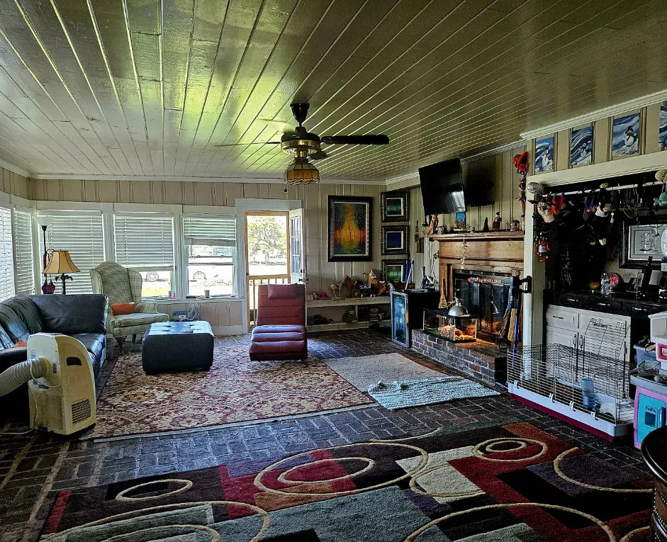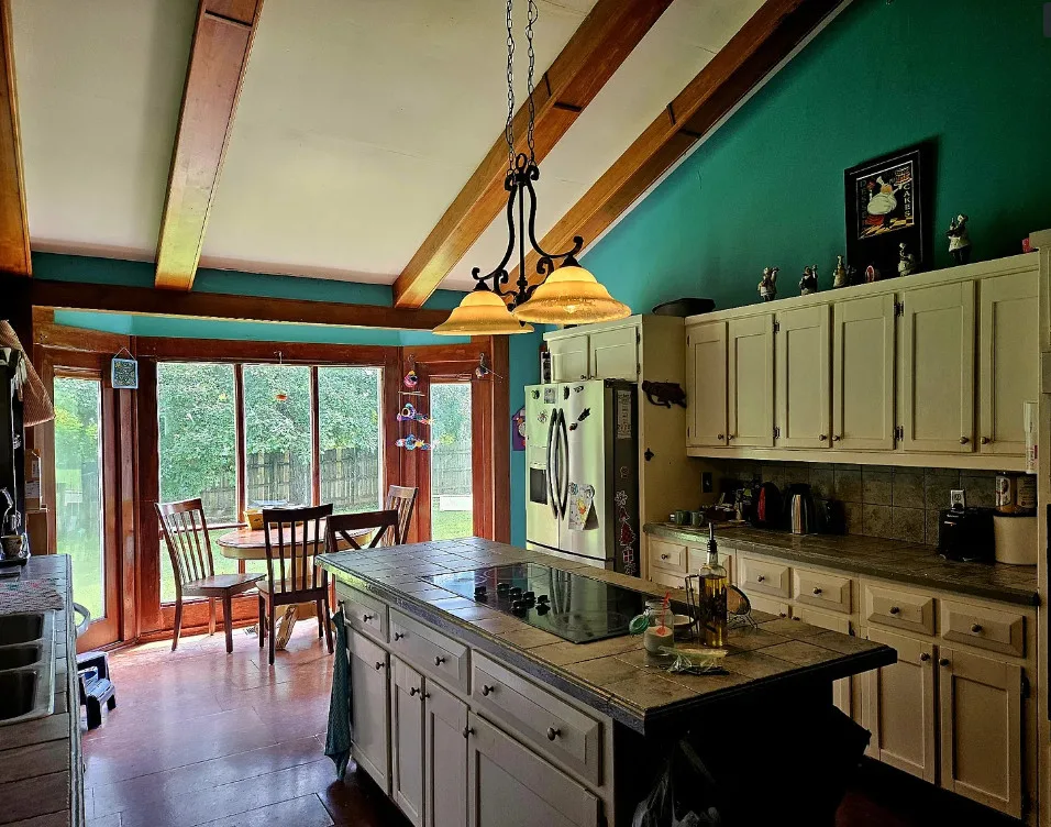 The updated kitchen and sunroom feature vaulted ceilings with exposed beams, tile countertops and backsplash, and charming brick paver floors. Whether entertaining guests or relaxing with family, the spacious family room and bright sunroom provide the perfect setting.