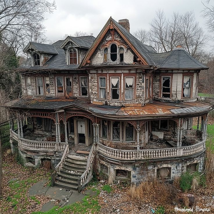 Hidden deep within a quiet grove of bare trees, this once-magnificent Victorian mansion stands as a ghostly monument to another era. With its ornate wraparound porch, arched gables, and intricate woodwork now weathered by time, the house whispers stories of elegance, family, and forgotten dreams. Its grandeur has faded, but the bones of its beauty remain strong — a hauntingly beautiful reminder of late 19th-century architecture.