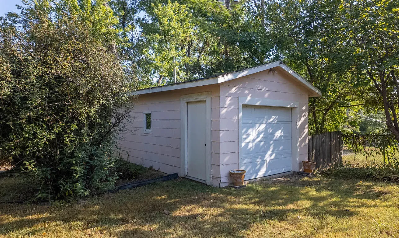 The property’s partially fenced yard is shaded by mature trees, creating a private outdoor retreat. A detached garage with concrete floors and electrical access offers plenty of space for parking, storage, or workshop use. There’s also a small unfinished basement that houses the utilities and doubles as a storm shelter—adding both practicality and peace of mind.