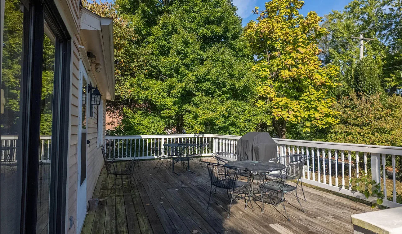 Step through the front door and into a warm, inviting space where history comes alive. The main living room features 10-foot ceilings, crown molding, wide baseboards, and original hardwood flooring reclaimed from a local shop—each board carrying its own story. The open floor plan leads into a cheerful dining area, perfect for family gatherings, and a bright, updated kitchen equipped with abundant cabinetry and modern appliances, including a refrigerator, stove, microwave, and dishwasher. From the kitchen, step onto the large back deck—ideal for entertaining, grilling, or enjoying quiet evenings surrounded by mature trees.