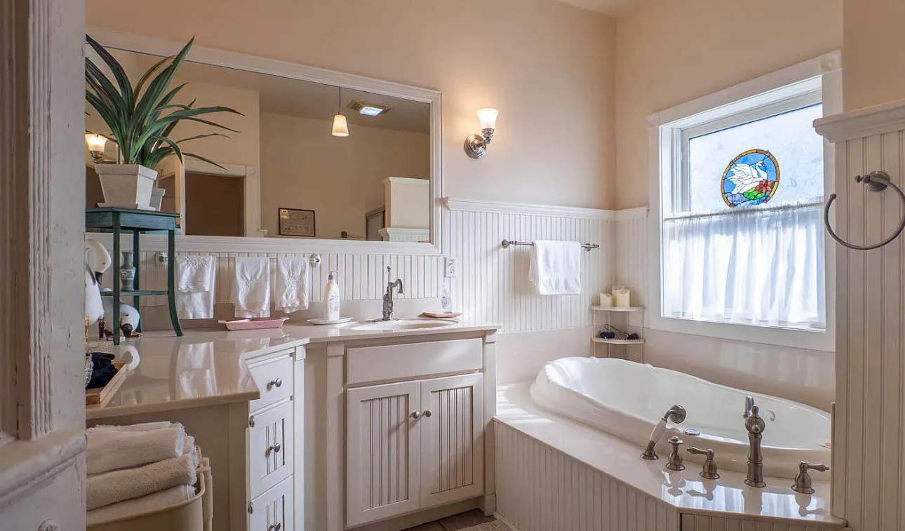 On the main level, two spacious bedrooms and a beautifully tiled bathroom provide comfort and privacy. The bath features a walk-in shower and luxurious jetted tub, blending historic style with modern relaxation. Upstairs, the third bedroom offers cozy alcoves that make wonderful reading nooks, play areas, or home offices. A full bathroom and additional storage complete the upper level, ensuring convenience and functionality for guests or family members.