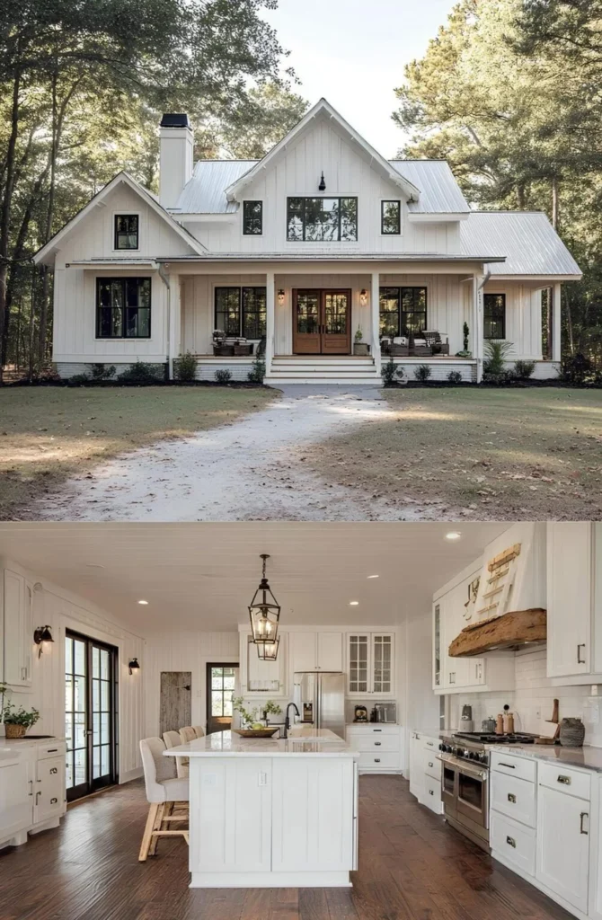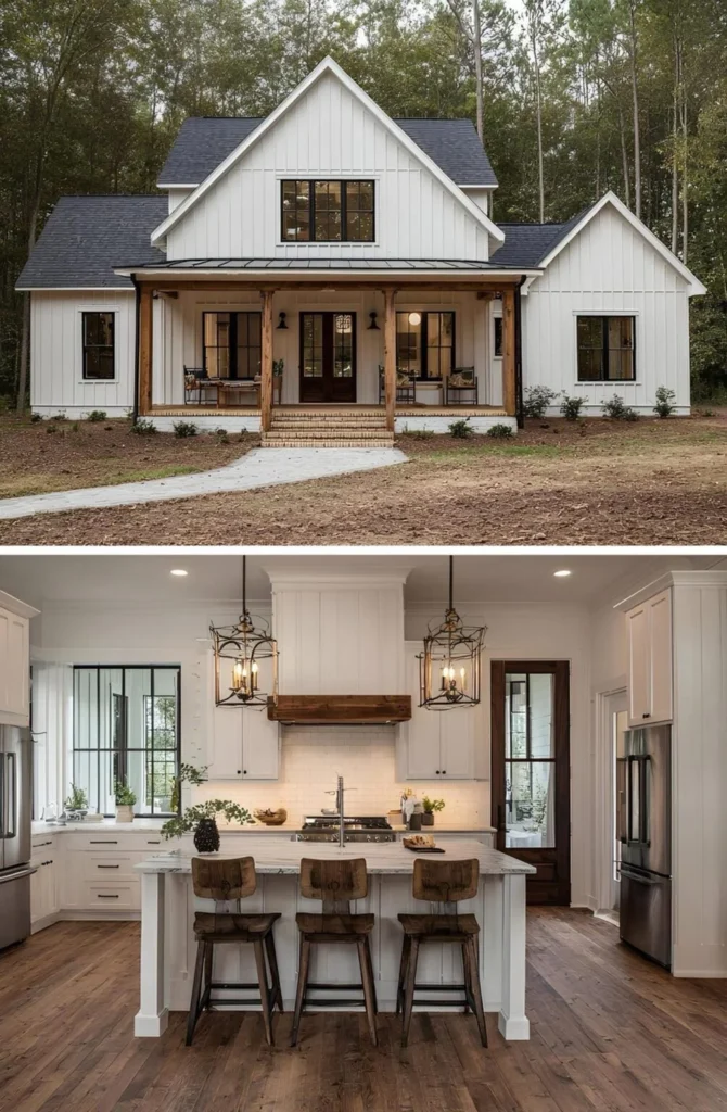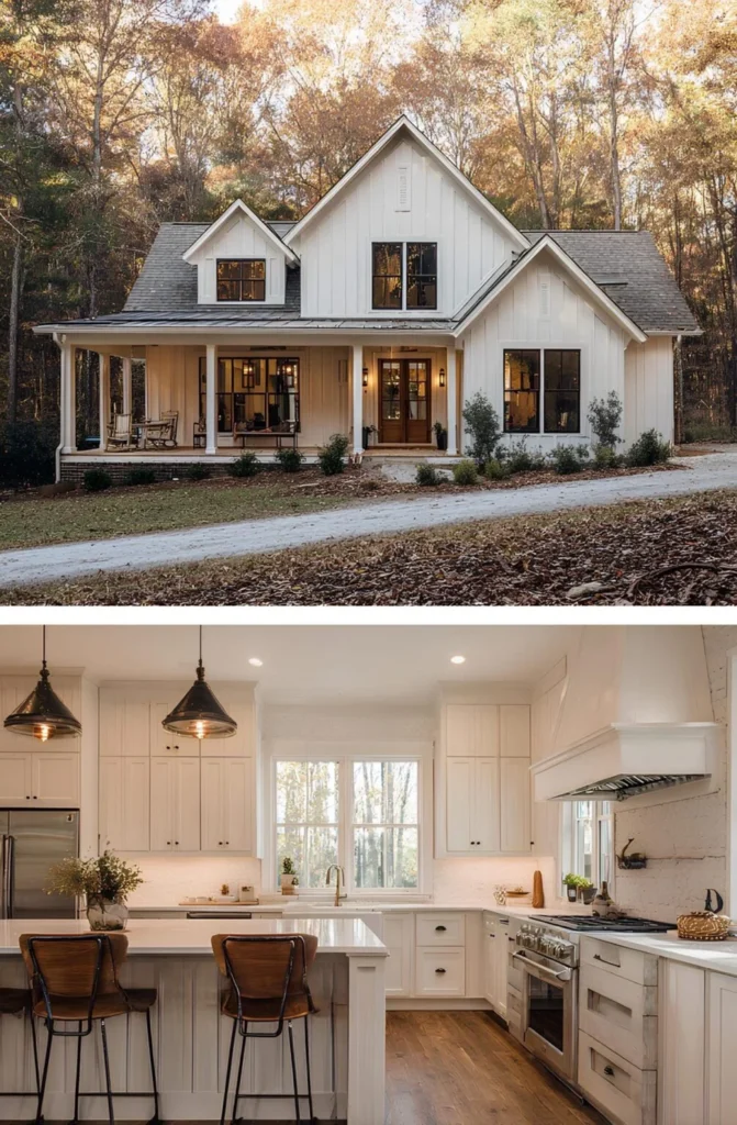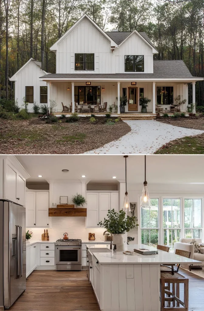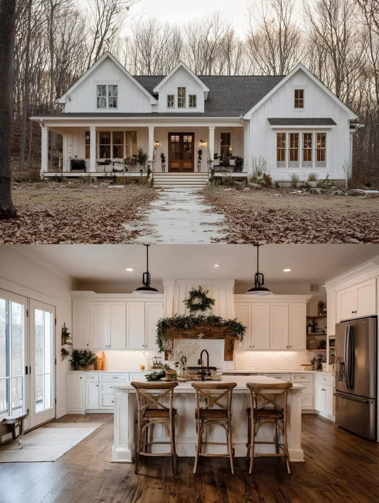 This farmhouse was built by a couple who had waited nearly a decade to find the right piece of land — a quiet, wooded lot close enough to town for groceries, but far enough for stars at night. They knew exactly what they wanted: an open kitchen with light pouring in, and space where their kids could spread out without anyone being too far apart. The wraparound porch became a favorite spot for homework and lemonade. They didn’t rush it — saved carefully, chose their finishes one step at a time, and ended up with a home that fits them perfectly.