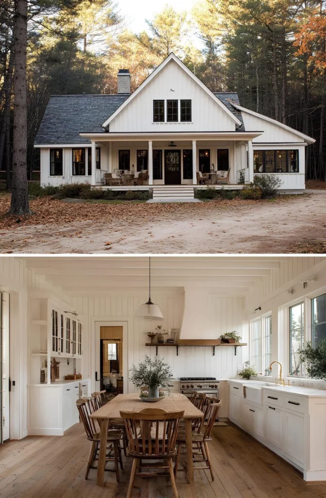 This farmhouse was built as a retirement dream for a couple who spent decades in a fast-moving coastal city. They wanted quiet mornings, golden leaves in the fall, and a kitchen that could seat all their grandkids at once. The dining table was the first thing they picked — everything else was designed around that. With tall trees outside every window and coffee always brewing on the stove, life here feels rooted. They chose a simple, classic layout and skipped a garage entirely. Their goal wasn’t storage — it was space for stories, meals, and long, slow days at home.