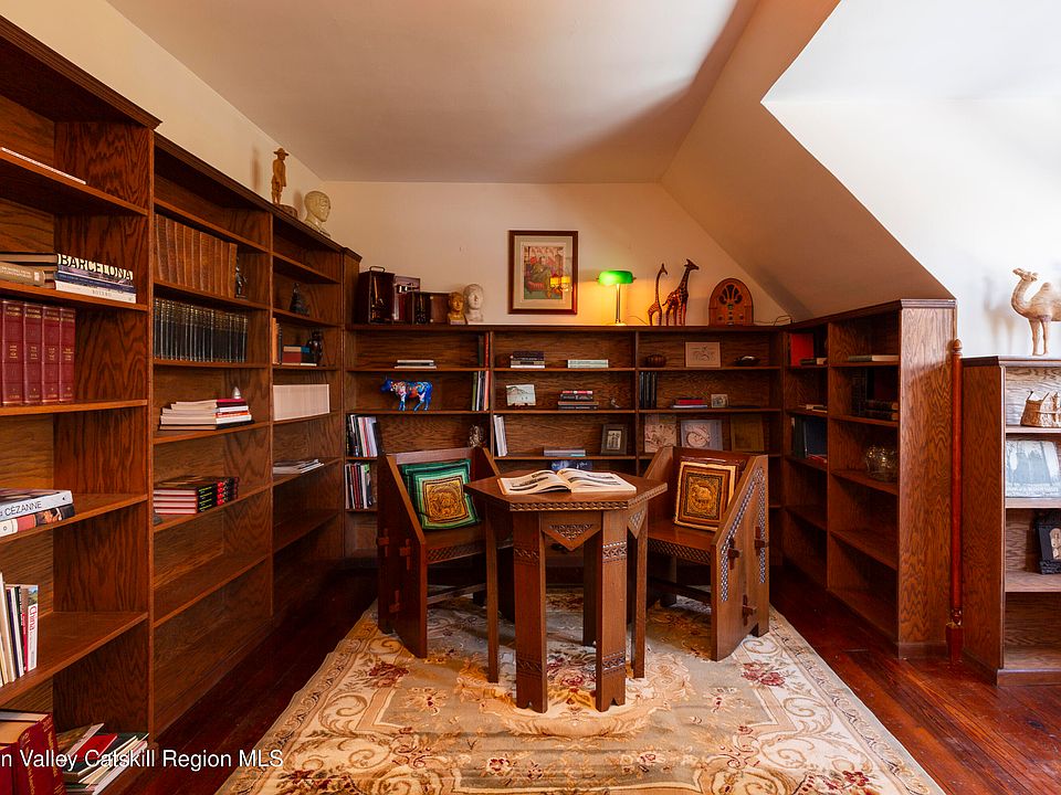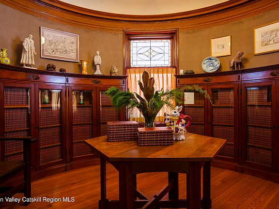 - Specialty Rooms: Formal dining room with oak paneling, library/den, home office, circular turret room with curved shelving, and a Tiffany pendant-lit reading alcove.