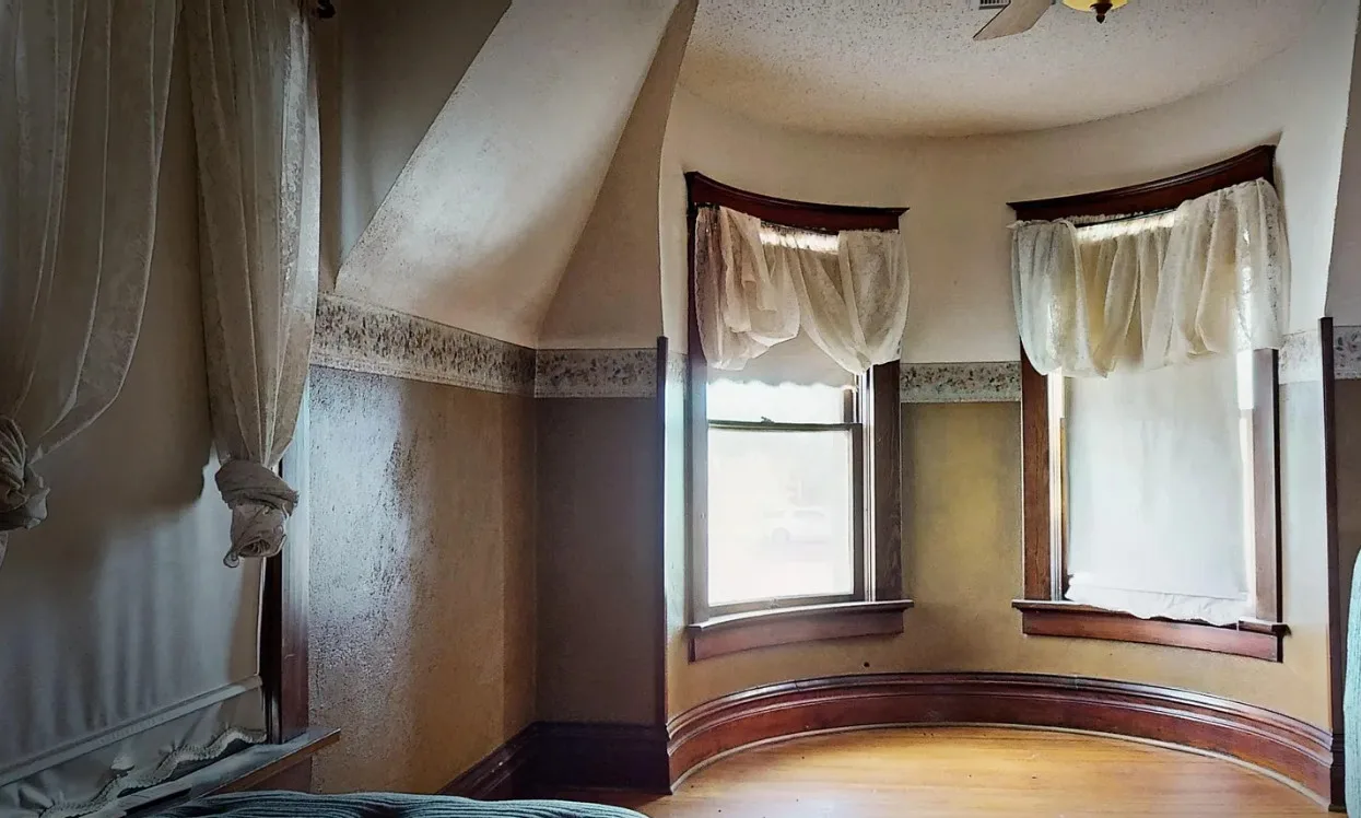 The inviting layout features a spacious covered front porch, welcoming vestibule, four bedrooms, two bathrooms, and an impressive 3,249 square feet of living space. Elegant circular sitting areas with curved glass windows highlight the craftsmanship of a bygone era, while a cozy fireplace seating area offers a warm and relaxing retreat.