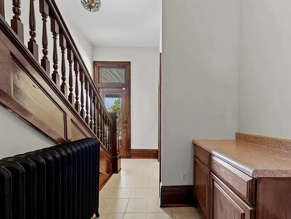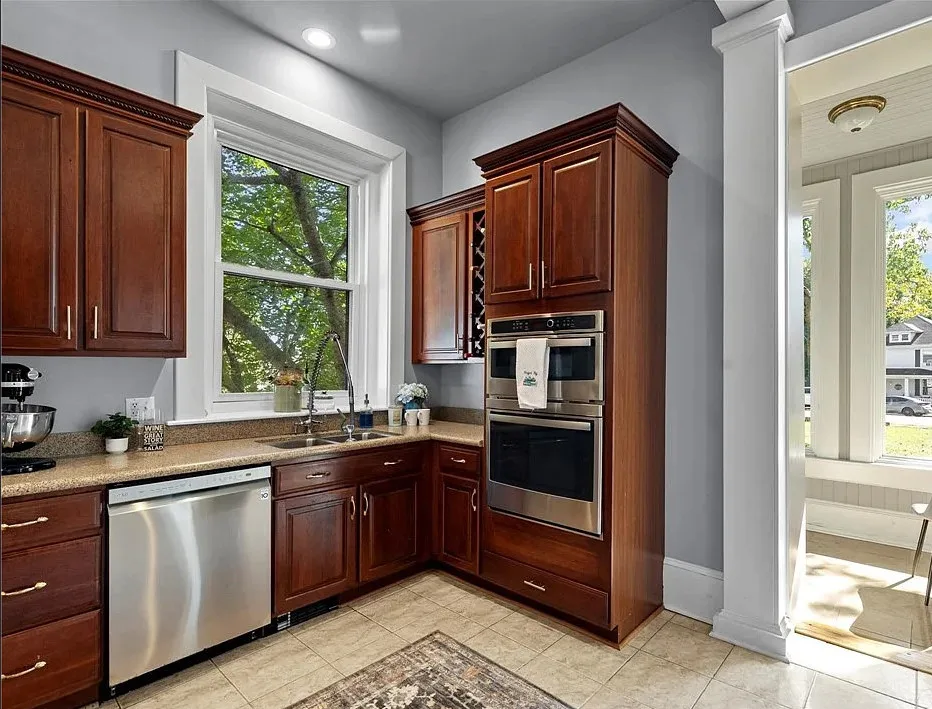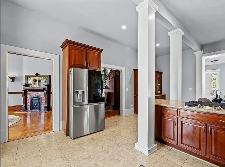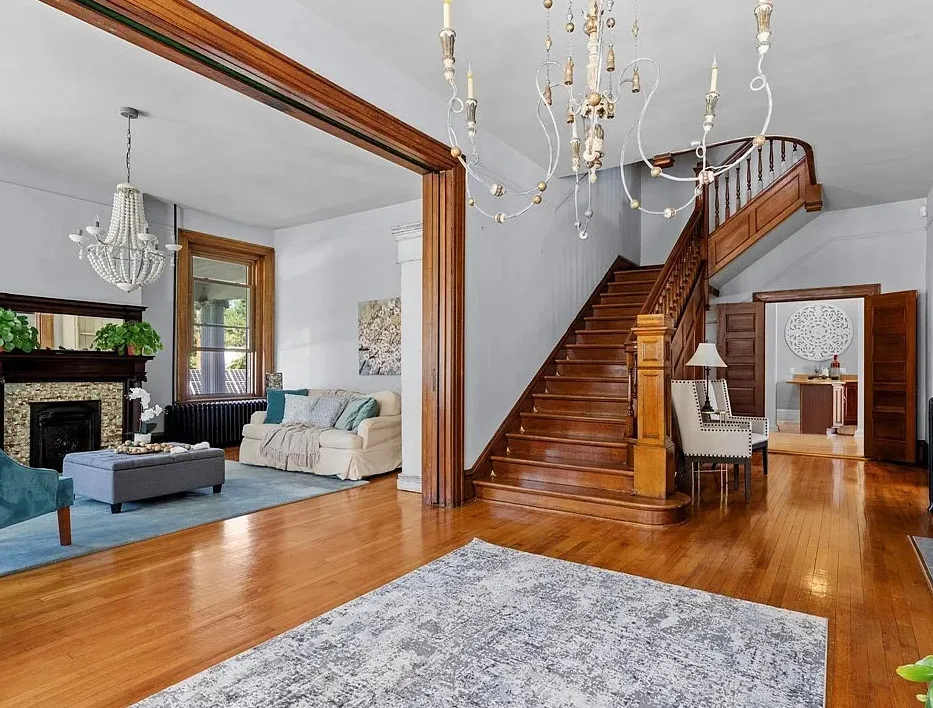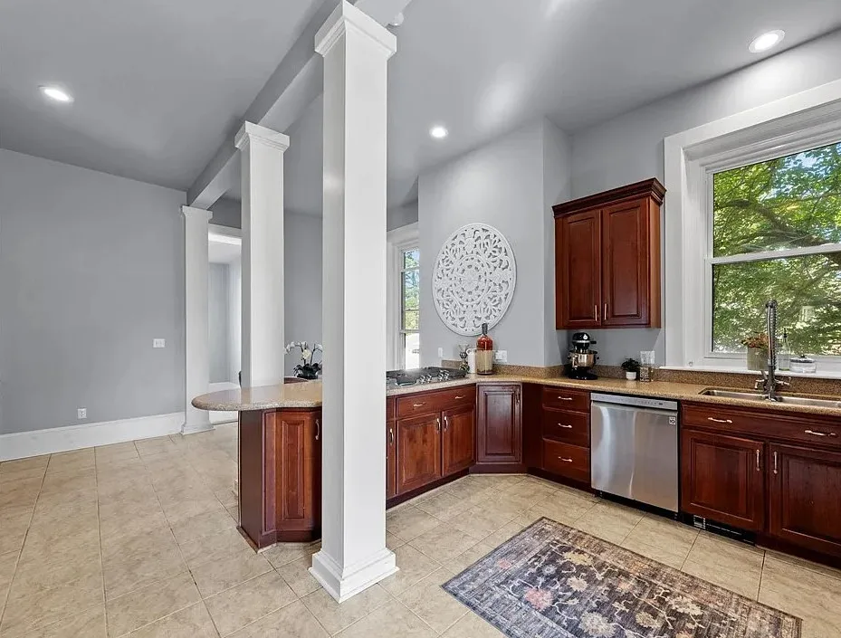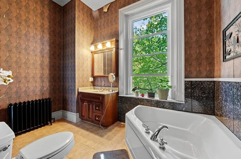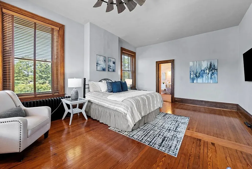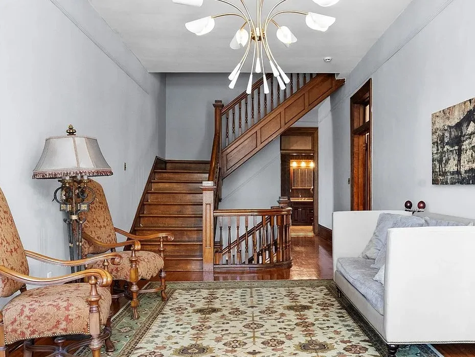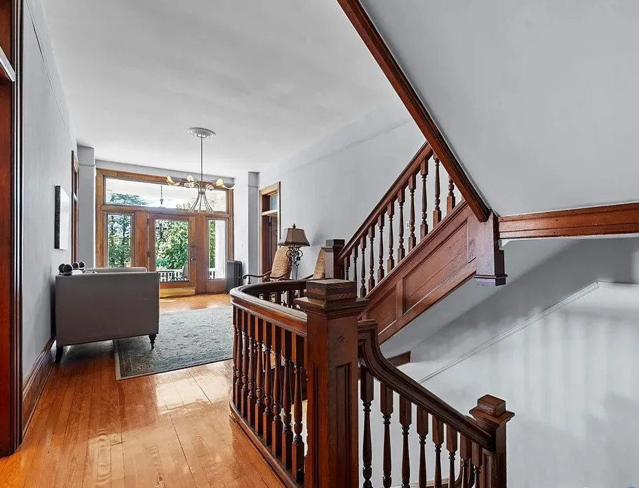 The main level is ideal for entertaining, featuring twin living rooms, a formal dining room, and a chef’s kitchen with granite countertops, cherry cabinetry, and newer stainless-steel appliances. Upstairs, a generous landing offers a cozy sitting area and opens onto a balcony overlooking Oliver Avenue, complete with chandelier lighting for added elegance.