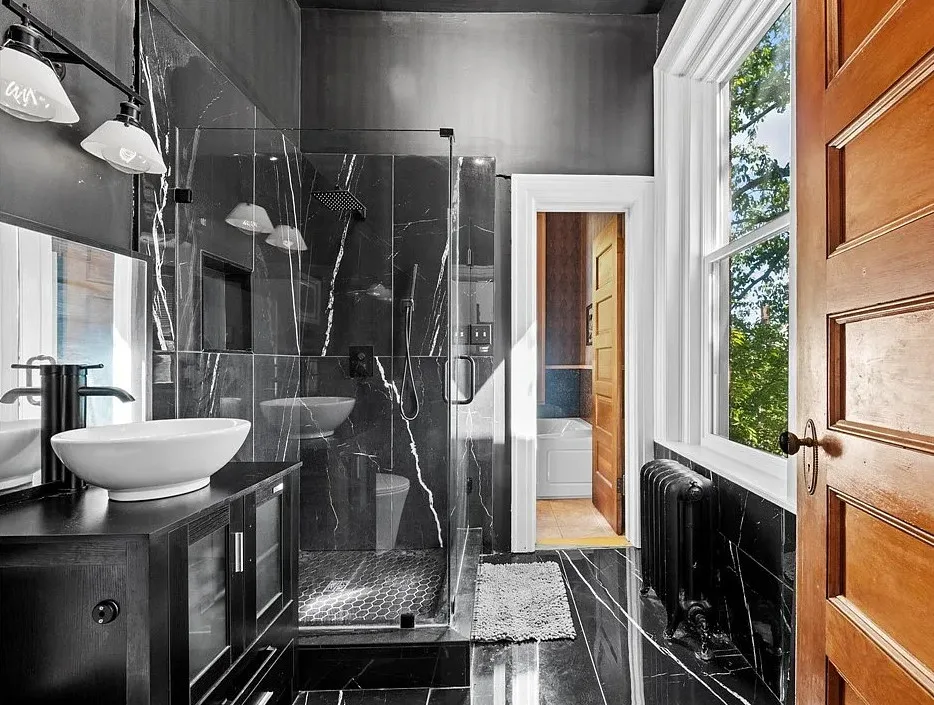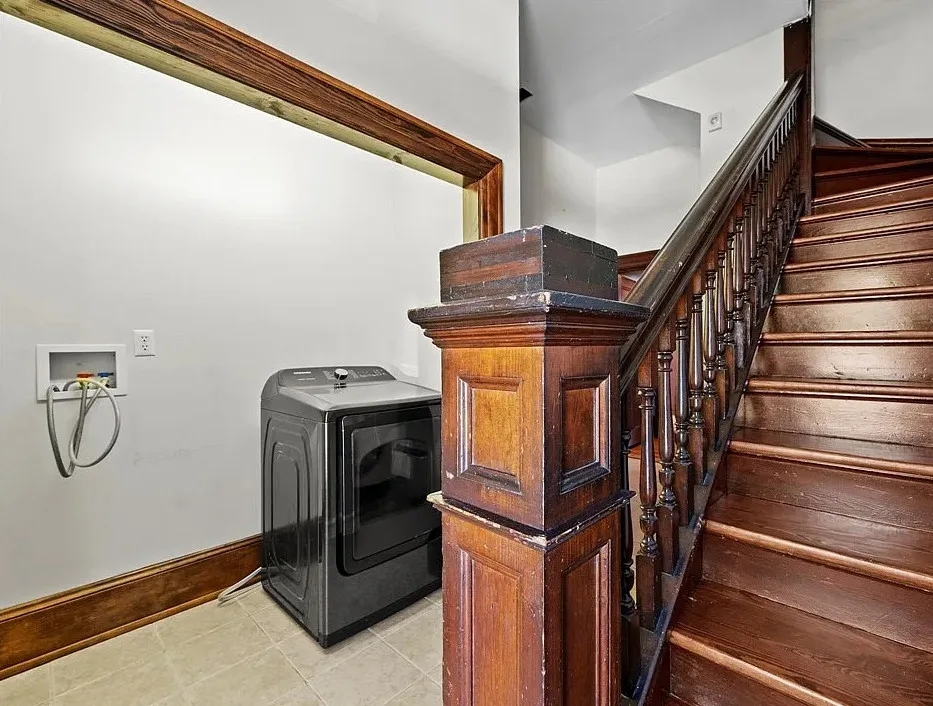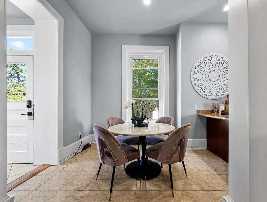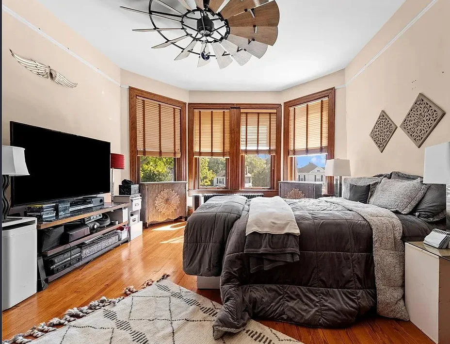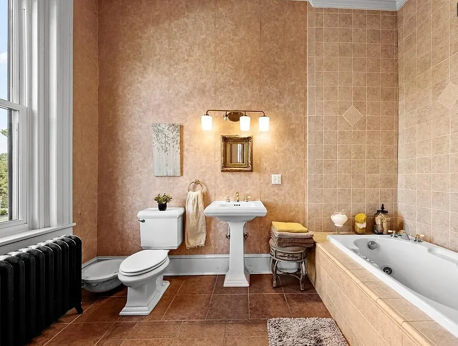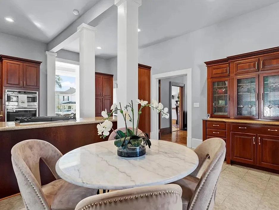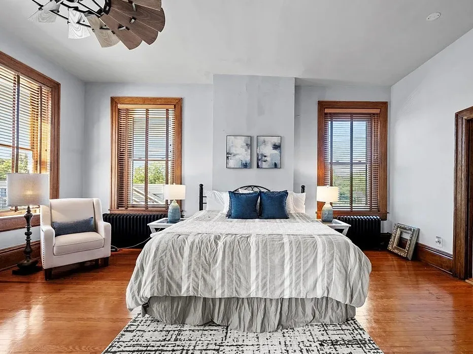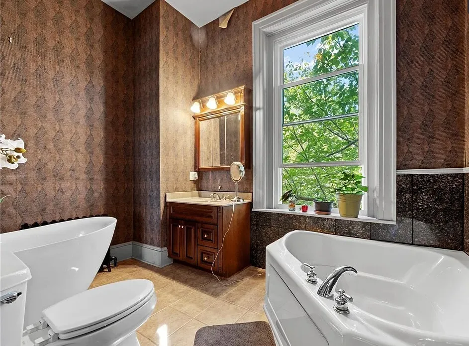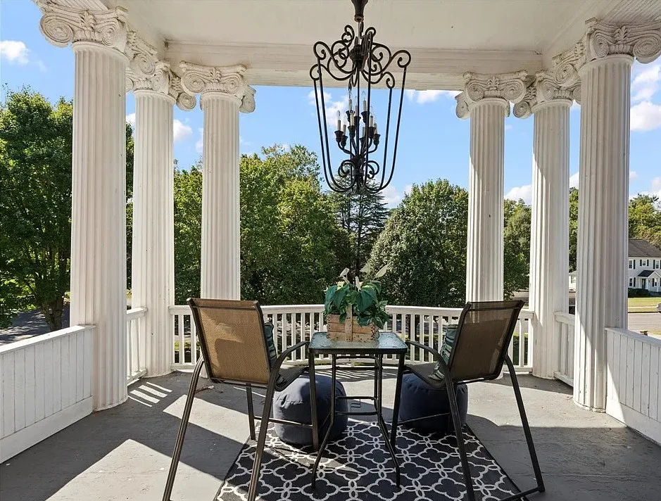 The main level is ideal for entertaining, featuring twin living rooms, a formal dining room, and a chef’s kitchen with granite countertops, cherry cabinetry, and newer stainless-steel appliances. Upstairs, a generous landing offers a cozy sitting area and opens onto a balcony overlooking Oliver Avenue, complete with chandelier lighting for added elegance.