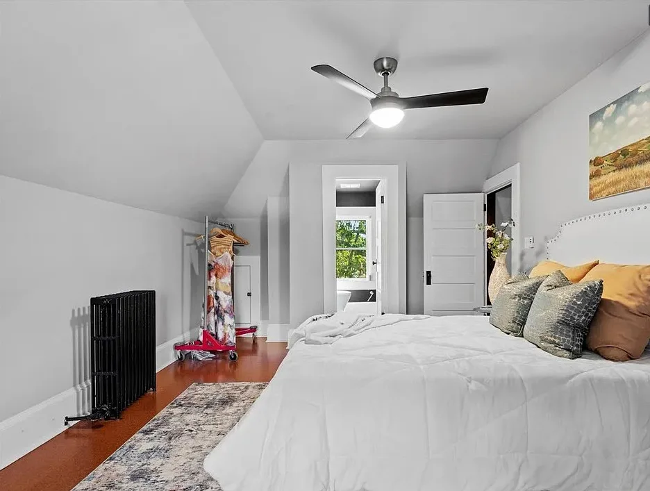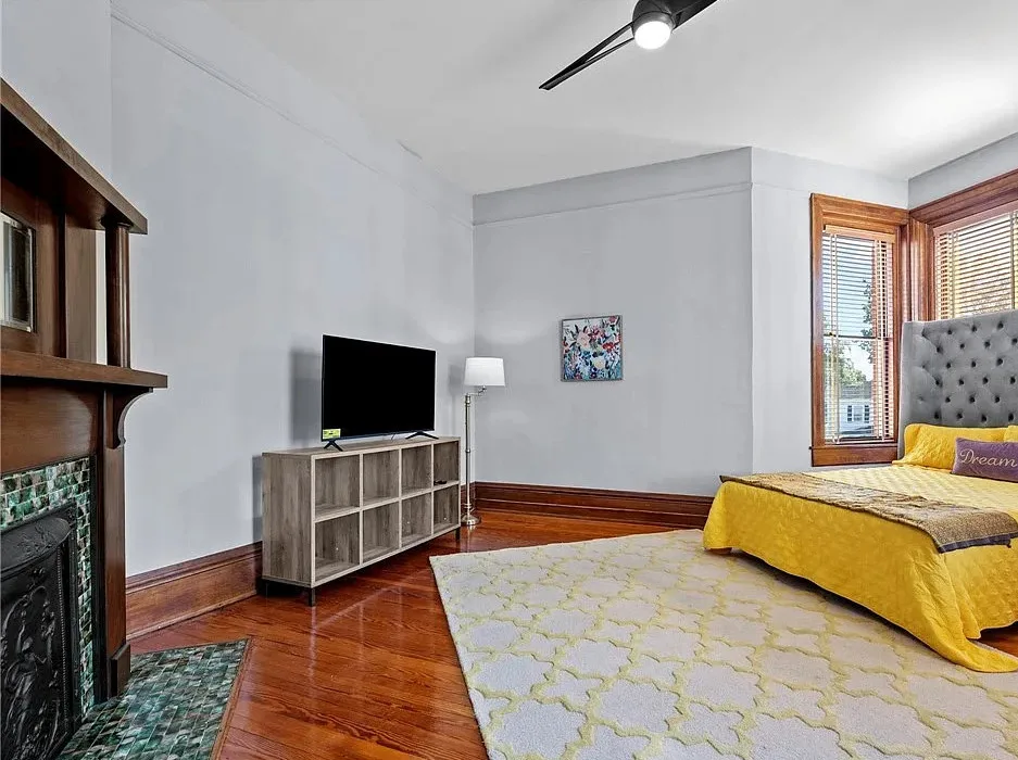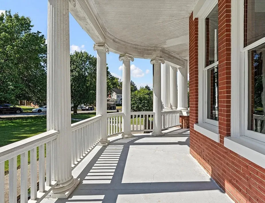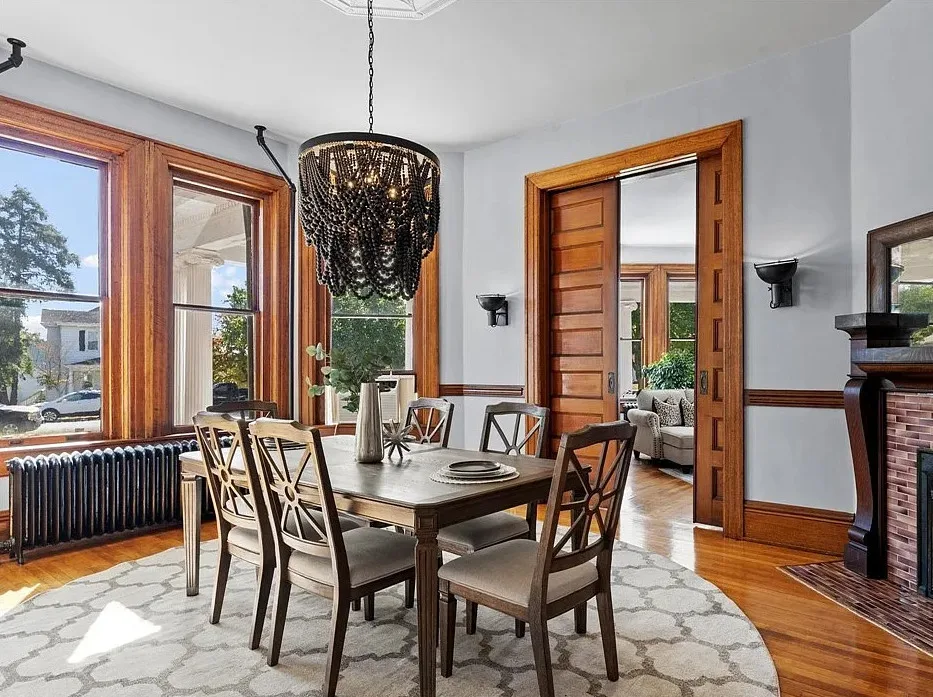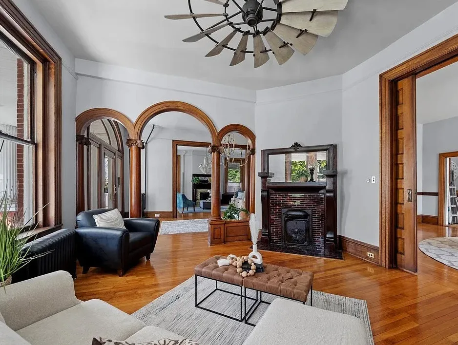 Nestled on 0.67 acre, the stately brick residence welcomes you with a wide wrap-around porch supported by steel columns imported from England, setting the tone for its distinguished craftsmanship. Inside, sunlight pours through abundant windows, illuminating 11-foot ceilings, original hardwood floors, and ornate moldings that echo the home’s early-20th-century charm. Details abound—arched entryways, transoms, pocket doors, and six fireplaces with exquisite mantles and tile surrounds.